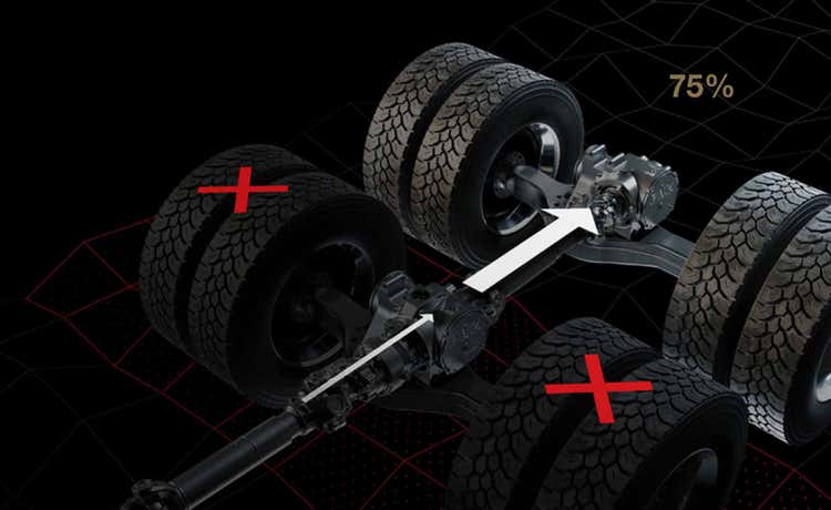 M El divisor de potencia entre ejes de Mack desvía hasta un 75% de la fuerza de torsión desde el eje sin tracción hacia el eje con tracción . No se requiere ninguna intervención por parte del conductor.